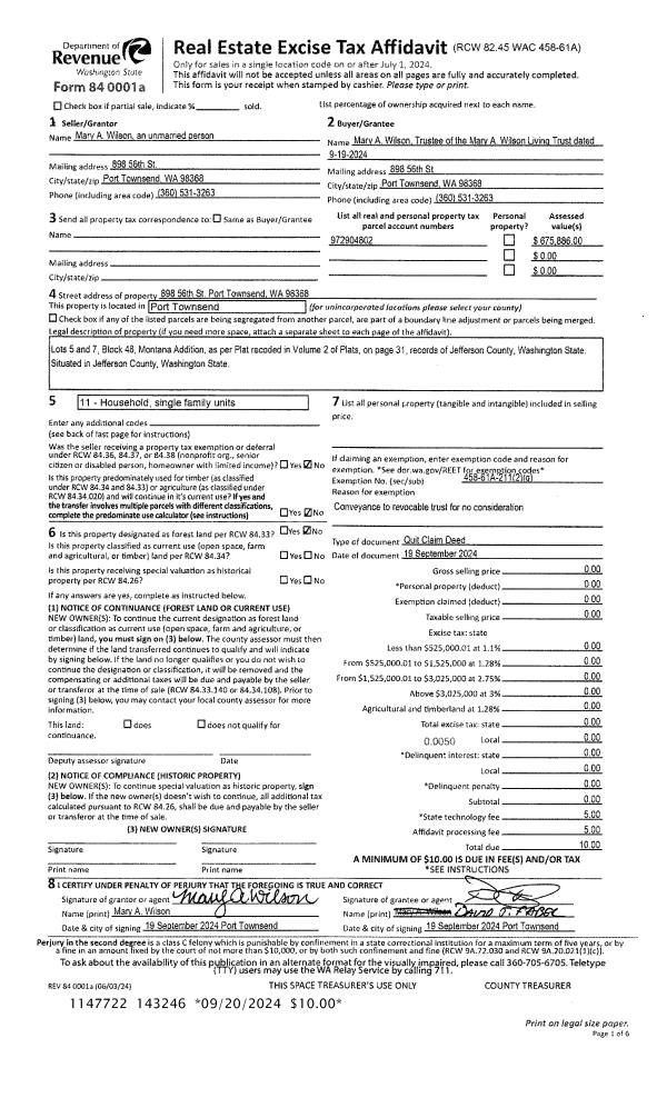 | 1 | 09/19/2024 | QCD | Quit Claim Deed | MARY A WILSON | MARY A WILSON LIVING TRUST | | | | 143246 | |