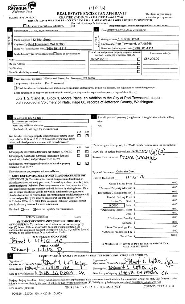 | 4 | 11/16/2018 | QCD | Quit Claim Deed | ROBERT L LITTLE JR | ROBERT L LITTLE JR | | | | 132306 | |