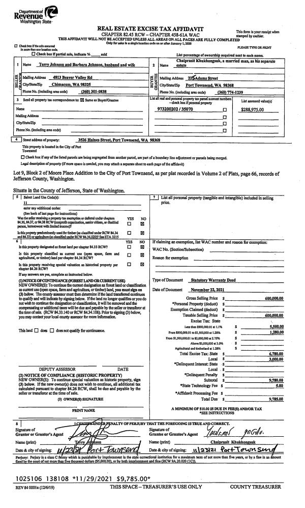 | 2 | 11/22/2021 | SWD | Statutory Warranty Deed | TERRY JOHNSON | CHAIPRASIT KHUKHONGSUK | | | $600,000.00 | 138108 | |