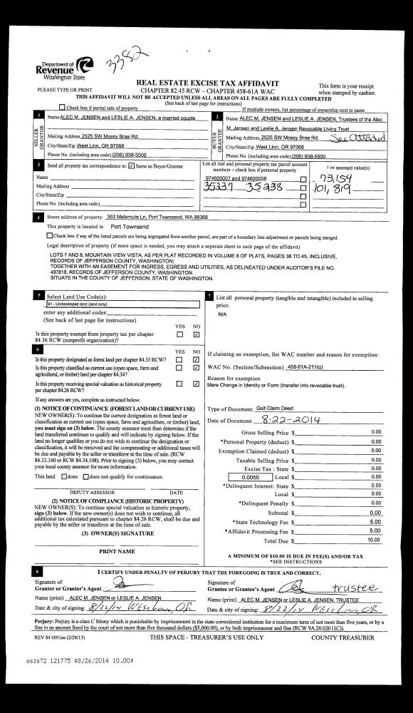 | 2 | 08/22/2014 | QCD | Quit Claim Deed | ALEC M & LESLIE A JENSEN | ALEC & LESLIE JENSEN REVOCALBE LIVING TRUST | | | | 121775 | |