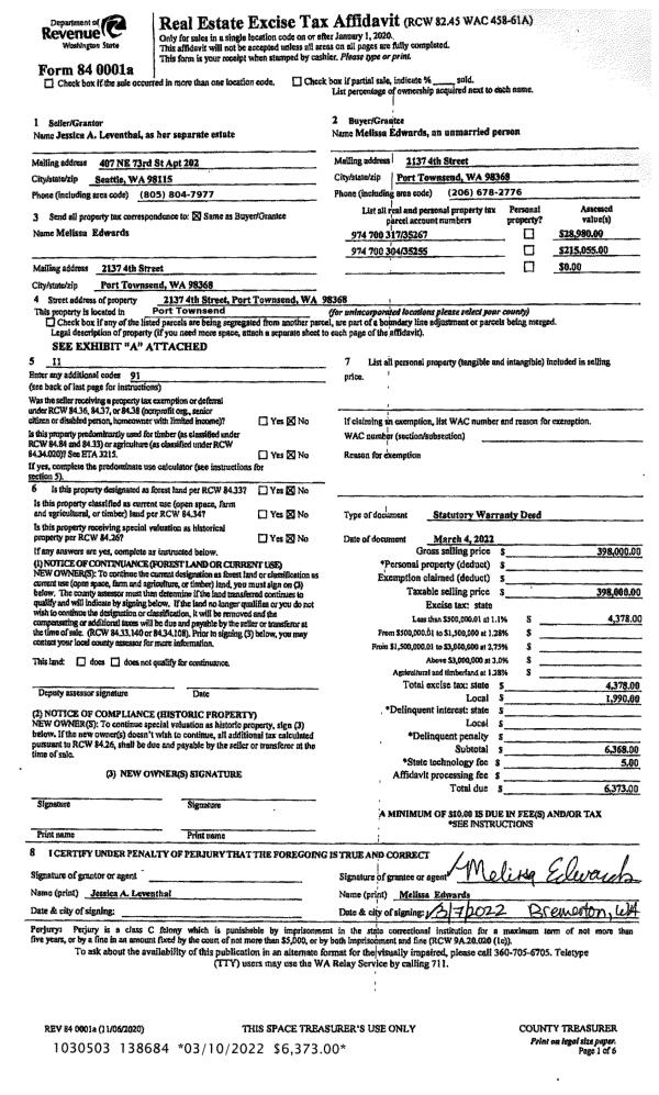 | 1 | 03/04/2022 | SWD | Statutory Warranty Deed | JESSICA A LEVENTHAL | MELISSA EDWARDS | | | $398,000.00 | 138684 | |