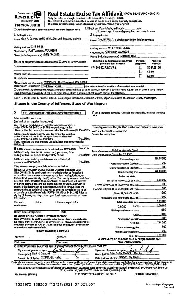 | 1 | 12/22/2021 | SWD | Statutory Warranty Deed | MARK H DUMOND | GHAS/AW LLC | | | $476,000.00 | 138265 | |