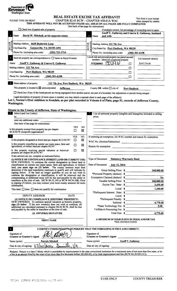 | 2 | 07/12/2016 | SWD | Statutory Warranty Deed | DAVID W MITCHELL | GEOFF & CEARRA GALLAWAY | | | $268,000.00 | 125910 | |