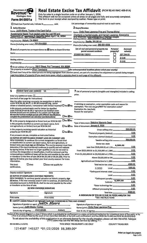 | 1 | 01/06/2026 | SWD | Statutory Warranty Deed | CAROL GALLUP SUPPLEMENTAL NEEDS TRUST | EMILY R LAWRENCE-PINE & | | | $399,000.00 | 145527 | |