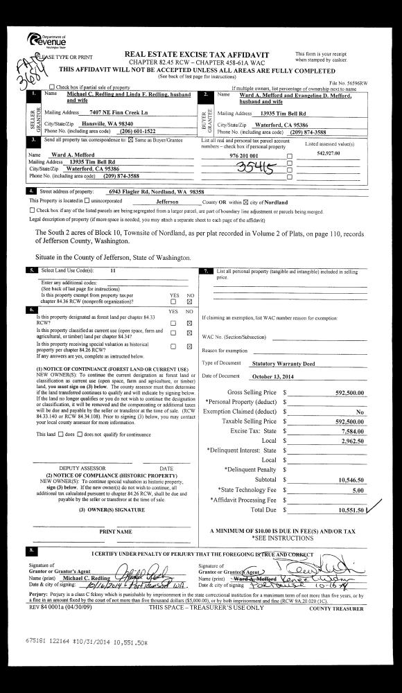 | 1 | 10/13/2014 | SWD | Statutory Warranty Deed | MICHAEL C REDLING | WARD A & EVANGELINE D MEFFORD | | | $592,500.00 | 122164 | |