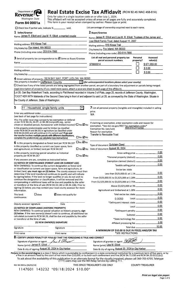 | 1 | 08/30/2024 | QCD | Quit Claim Deed | LISA M & JAMES R ELLIOTT | JAMES & LISA ELLIOTT FAMILY TRUST | | | | 143232 | |