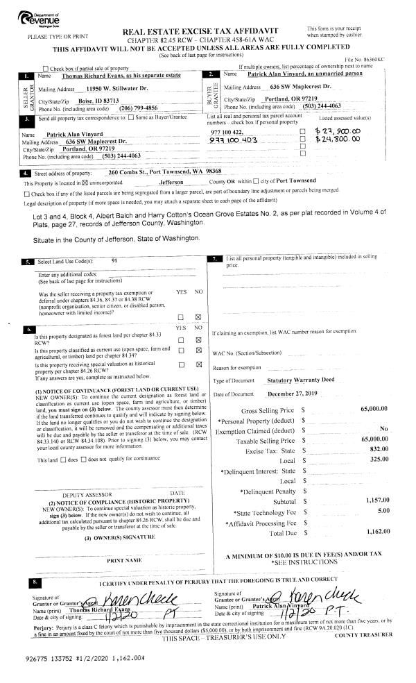 | 1 | 12/27/2019 | SWD | Statutory Warranty Deed | THOMAS R EVANS | PATRICK A VINYARD | | | $65,000.00 | 133752 | |