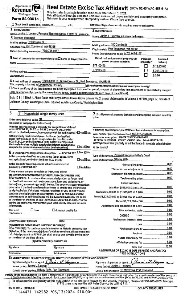 | 1 | 05/10/2024 | PRD | Personal Representatives Deed | LAWRENCE & JANICE LAYMAN | JANICE L LAYMAN | | | | 142582 | |
