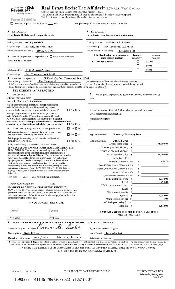 | 2 | 06/22/2023 | SWD | Statutory Warranty Deed | KEVIN B DOHR | DAVID A SARTI | | | $98,000.00 | 141146 | |