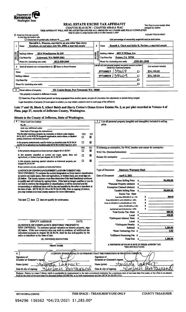 | 1 | 04/02/2021 | SWD | Statutory Warranty Deed | MEREDITH L FLAMME | RUSSELL A CLARK & SYLKE K PORTNER | | | $80,000.00 | 136562 | |