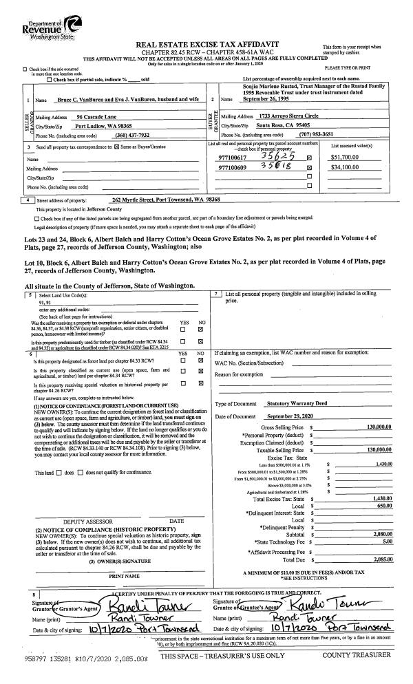 | 2 | 09/29/2020 | SWD | Statutory Warranty Deed | BRUCE C VAN BUREN | RUSTAD FAMILY TRUST | | | $130,000.00 | 135281 | |