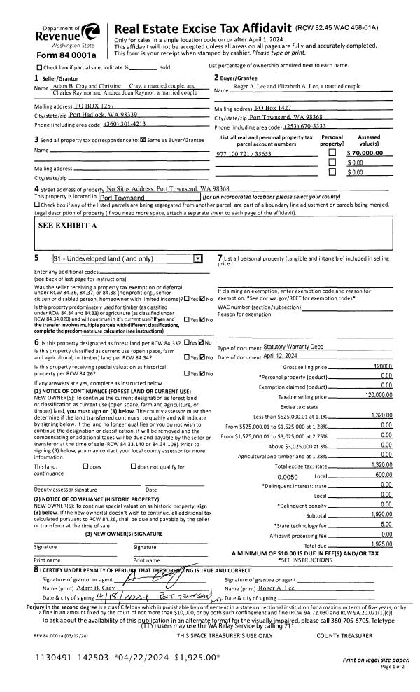 | 2 | 04/12/2024 | SWD | Statutory Warranty Deed | ADAM CRAY | ROGER A & ELIZABETH A LEE | | | $120,000.00 | 142503 | |