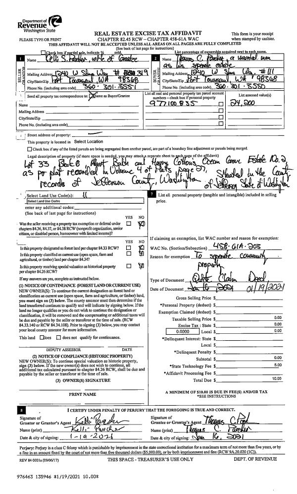 | 2 | 01/19/2021 | QCD | Quit Claim Deed | KELLI S PARCHER | THOMAS C PARCHER | | | | 135946 | |