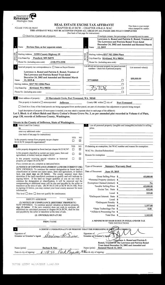 | 2 | 06/15/2015 | SWD | Statutory Warranty Deed | DARLENE B SINE | LAWRENCE A ROMEL TRUSTEE | | | $65,000.00 | 123397 | |