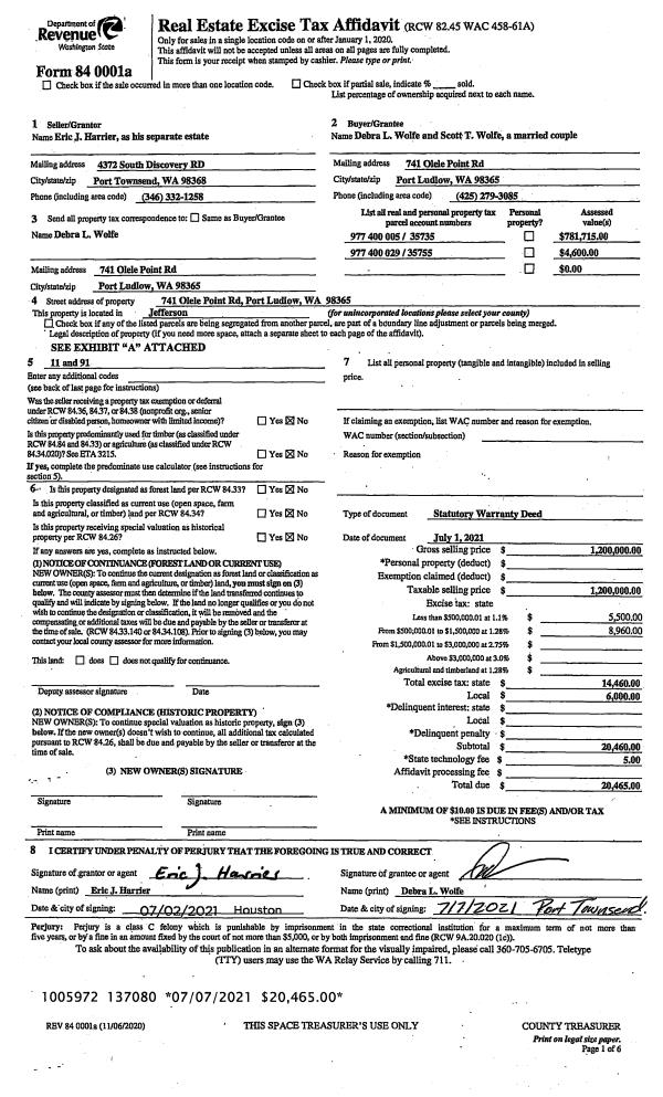 | 1 | 07/01/2021 | SWD | Statutory Warranty Deed | ERIC HARRIER | SCOTT T & DEBRA L WOLFE | | | $1,200,000.00 | 137080 | |