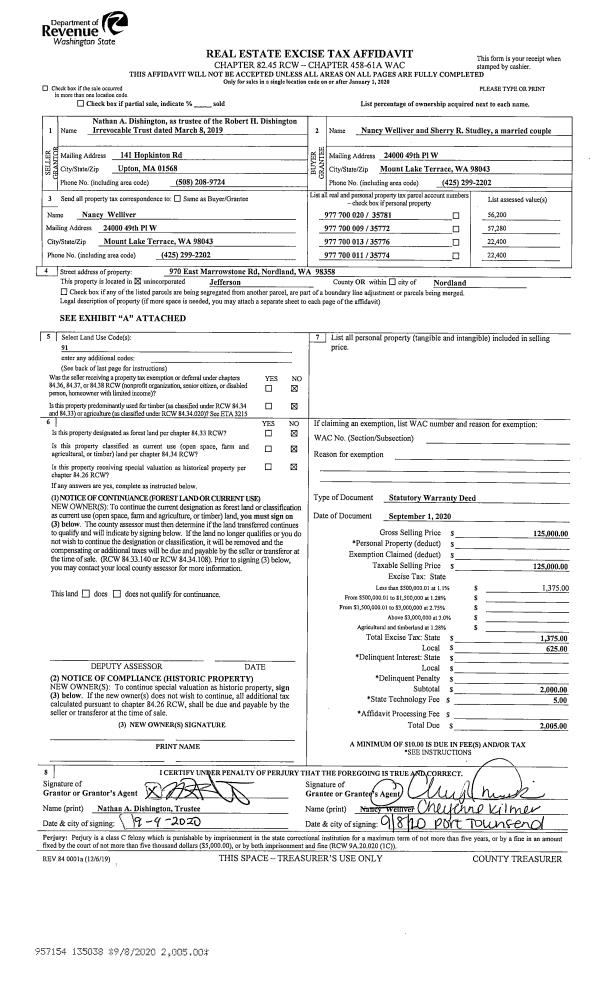 | 1 | 09/01/2020 | SWD | Statutory Warranty Deed | ROBERT H DISHINGTON | NANCY WELLIVER & SHERRY R STUDLEY | | | $125,000.00 | 135038 | |