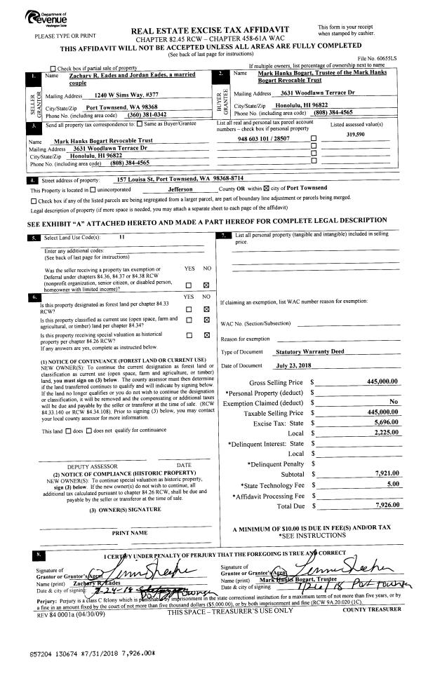 | Mailing Address: | KATHERINE & JAMES KUNC TRUSTEES 611 POLK ST PORT TOWNSEND, WA 98368-6531 | % Ownership: | 100.0000000000% |