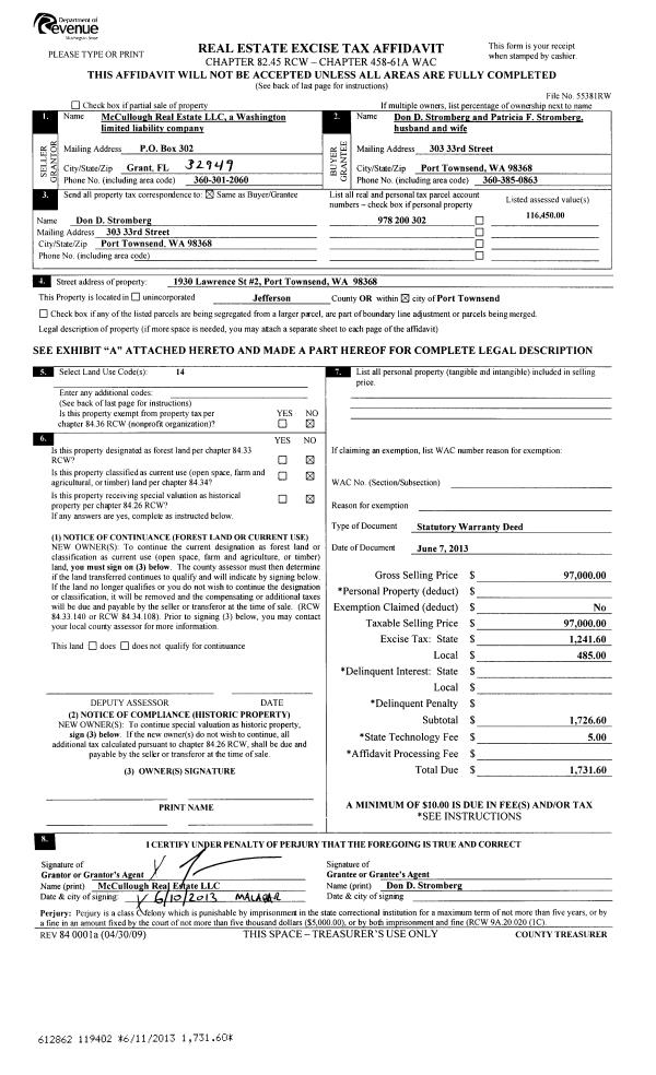 | 5 | 06/11/2013 | SWD | Statutory Warranty Deed | MC CULLOUGH REAL ESTATE LLC | PATRICIA STROMBERG | | | $97,000.00 | 119402 | |