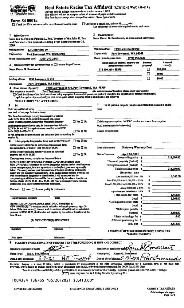 | 1 | 04/23/2021 | SWD | Statutory Warranty Deed | JON K FOX TRUSTEE | KAREN G BONDURANT | | | $213,000.00 | 136765 | |
