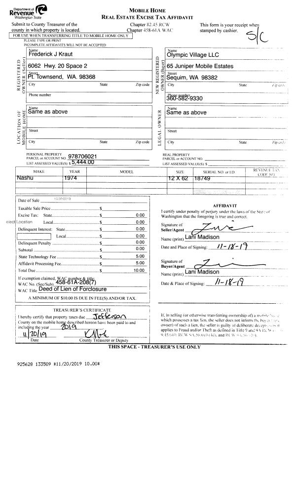 | 5 | 11/20/2019 | MH | Mobile Home | FREDERICK J KRAUT | OLYMPIC VILLAGE MHP LLC | | | | 133509 | |