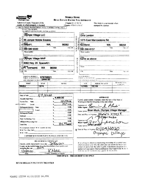 | 4 | 01/09/2020 | MH | Mobile Home | OLYMPIC VILLAGE MHP LLC | GINA R LANDON | | | $4,999.00 | 133799 | |