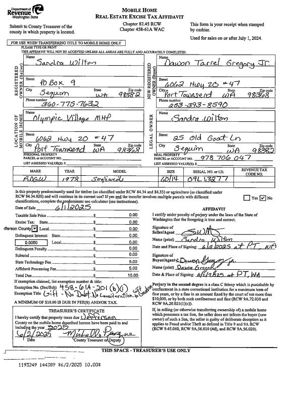 | 3 | 06/01/2025 | MH | Mobile Home | SANDRA WILTON | DAWON T GREGORY JR | | | $0.00 | 144389 | |