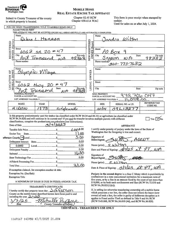 | 4 | 03/07/2025 | MH | Mobile Home | DEBRA L HANSEN | SANDRA WILTON | | | $1,000.00 | 143958 | |