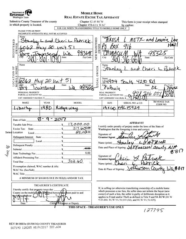 | 2 | 08/09/2017 | MH | Mobile Home | STANLEY L & CHERI L PATRICK | TERESA L METZ | | | $17,000.00 | 128285 | |