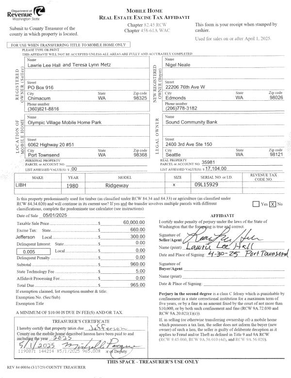 | 1 | 05/01/2025 | MH | Mobile Home | TERESA L METZ | NIGEL NEALE | | | $60,000.00 | 144214 | |