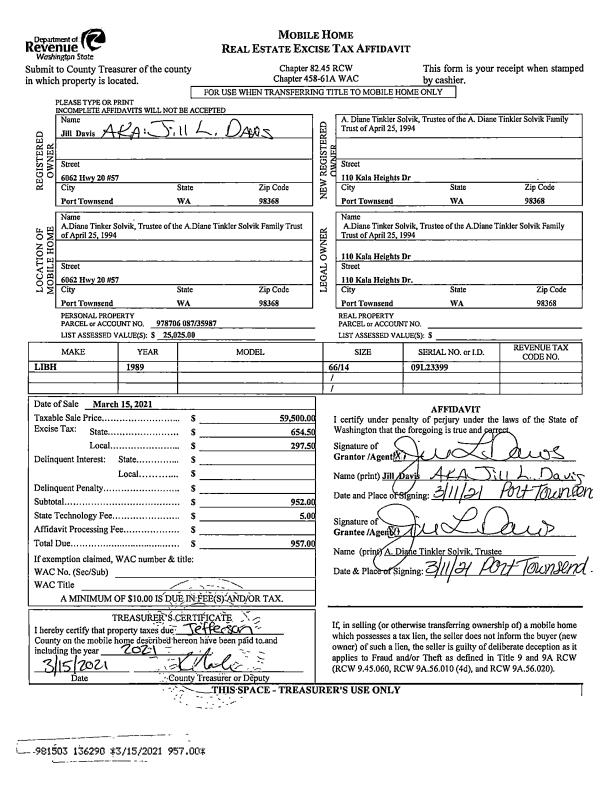 | 1 | 03/15/2021 | MH | Mobile Home | JILL DAVIS | DIANE TINKLER SOLVIK TRUSTEE | | | $59,500.00 | 136290 | |