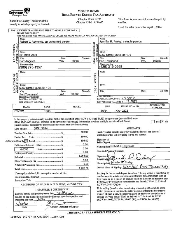 | 1 | 06/21/2024 | MH | Mobile Home | ROBERT J REYNOLDS | JENNIFER R FRALEY | | | $79,000.00 | 142787 | |