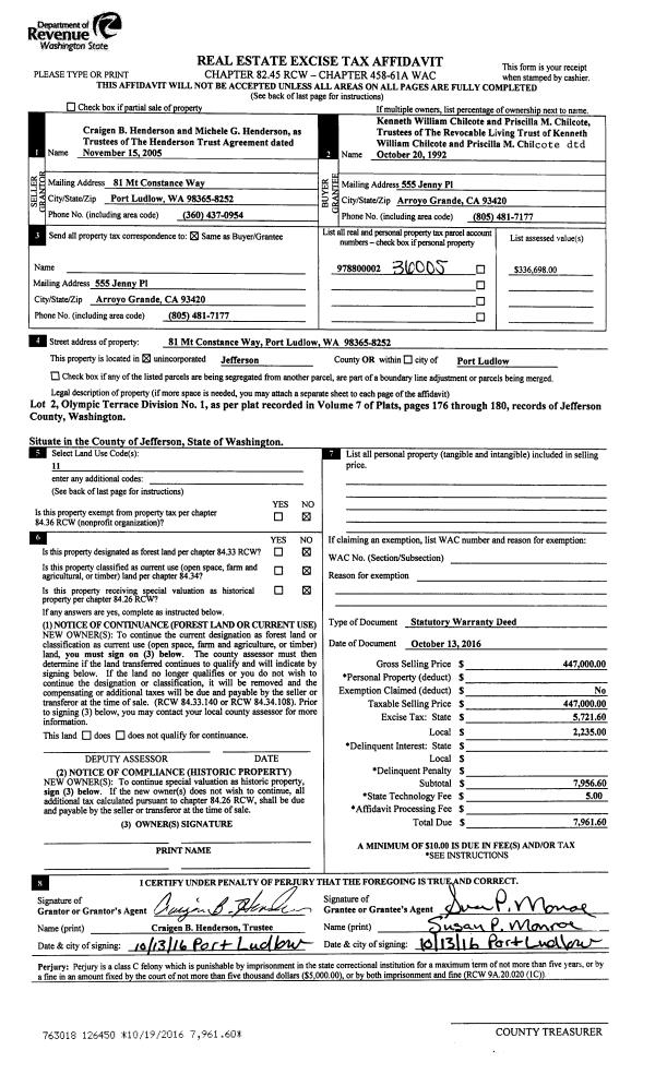 | 2 | 10/13/2016 | SWD | Statutory Warranty Deed | HENDERSON TRUST AGREEMENT | CHILCOTE REVOCABLE LIVING TRUST | | | $447,000.00 | 126450 | |