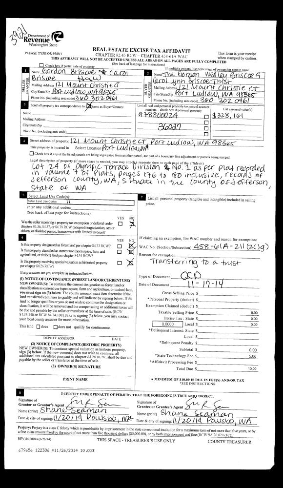 | Mailing Address: | GORDON W BRISCOE TRUSTEE CAROL LYNN TRUSTEE 121 MT CHRISTIE CT PORT LUDLOW, WA 98365-8257 | % Ownership: | 100.0000000000% |