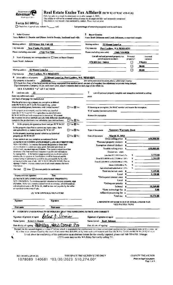 | 4 | 03/12/2004 | SWD | Statutory Warranty Deed | PORT LUDLOW ASSOCIATES LL | HILDT FAMILY TRUST | 0 | 0 | $296,100.00 | 99815 | 0 |