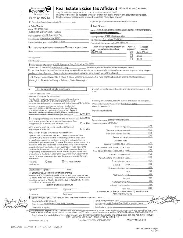 | 1 | 06/28/2022 | SWD | Statutory Warranty Deed | SMITH TRUST | JUDITH & TOM SMITH | | | | 139935 | |