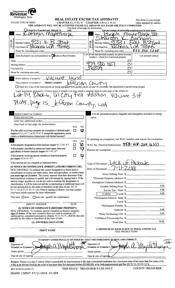 | 1 | 07/11/2018 | LOP | Lack of Probate | KATHRYN MAPLETHORPE | JOSEPH MAPLETHORPE III | | | | 130547 | |