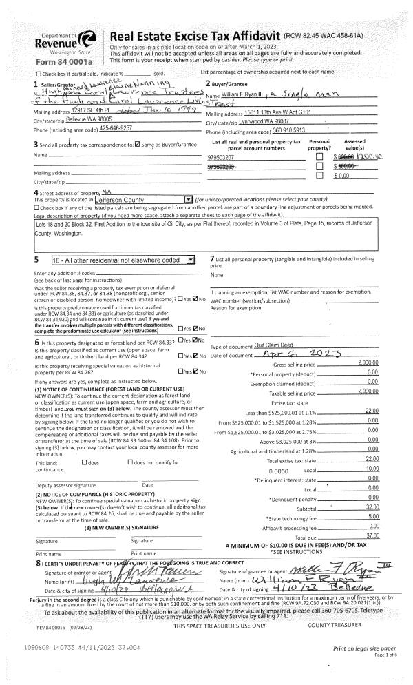 | 1 | 04/06/2023 | QCD | Quit Claim Deed | HUGH MINARD LAWRENCE TRUSTE | WILLIAM F RYAN III | | | $2,000.00 | 140733 | |