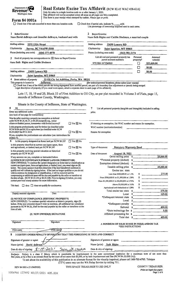 | 1 | 08/18/2021 | SWD | Statutory Warranty Deed | DAVID DE BRUYN | SETH RIGLES & CAITLIN SHELMAN | | | $25,000.00 | 137492 | |