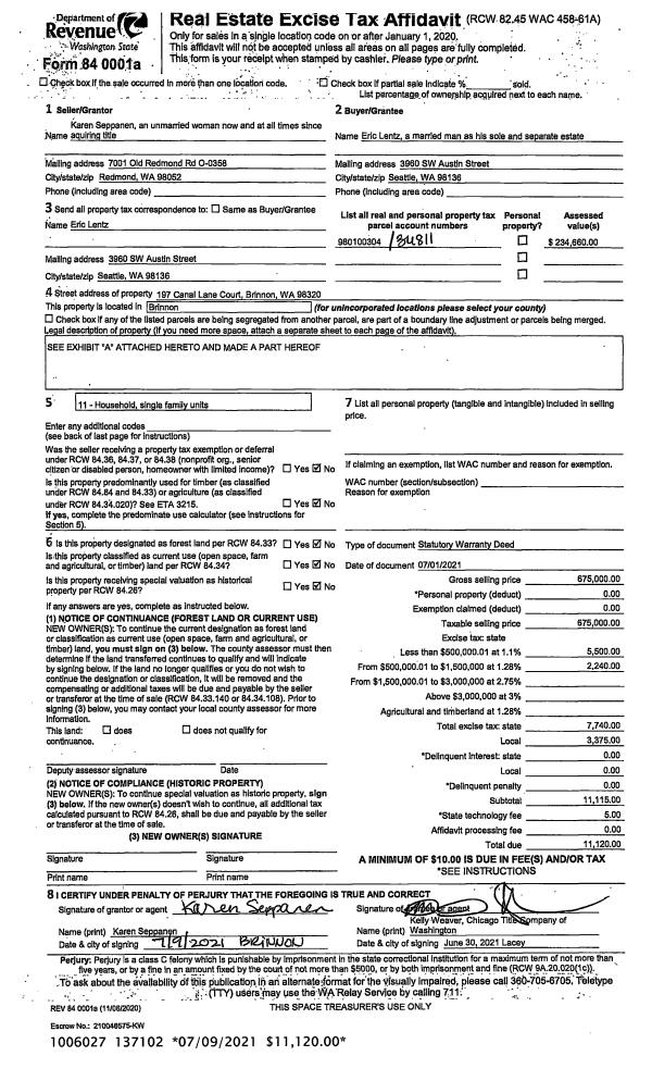 | 2 | 07/01/2021 | SWD | Statutory Warranty Deed | KAREN A SEPPANEN | ERIC LENTZ | | | $675,000.00 | 137102 | |