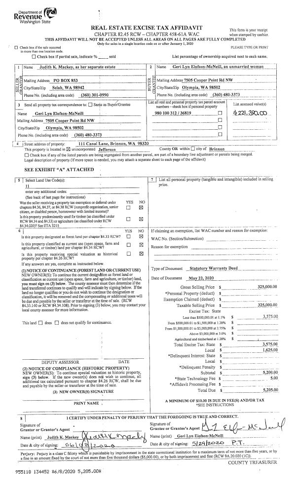 | 1 | 05/22/2020 | SWD | Statutory Warranty Deed | JUDITH K MACKEY | GERI L ELOFSON MCNEILL | | | $325,000.00 | 134452 | |