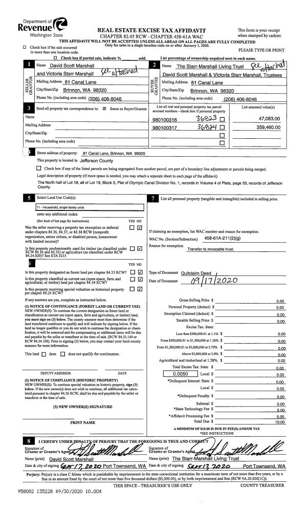 | 1 | 09/17/2020 | QCD | Quit Claim Deed | DAVID SCOTT MARSHALL | STARR MARSHALL LIVING TRUST | | | | 135228 | |