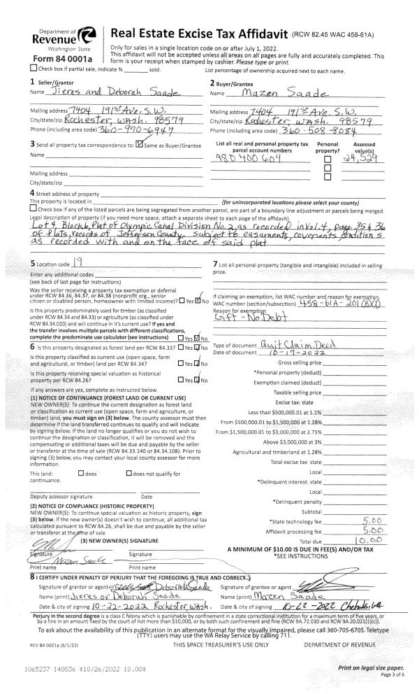 | 1 | 10/17/2022 | QCD | Quit Claim Deed | JIERES SAADE | MAZEN SAADE | | | | 140036 | |