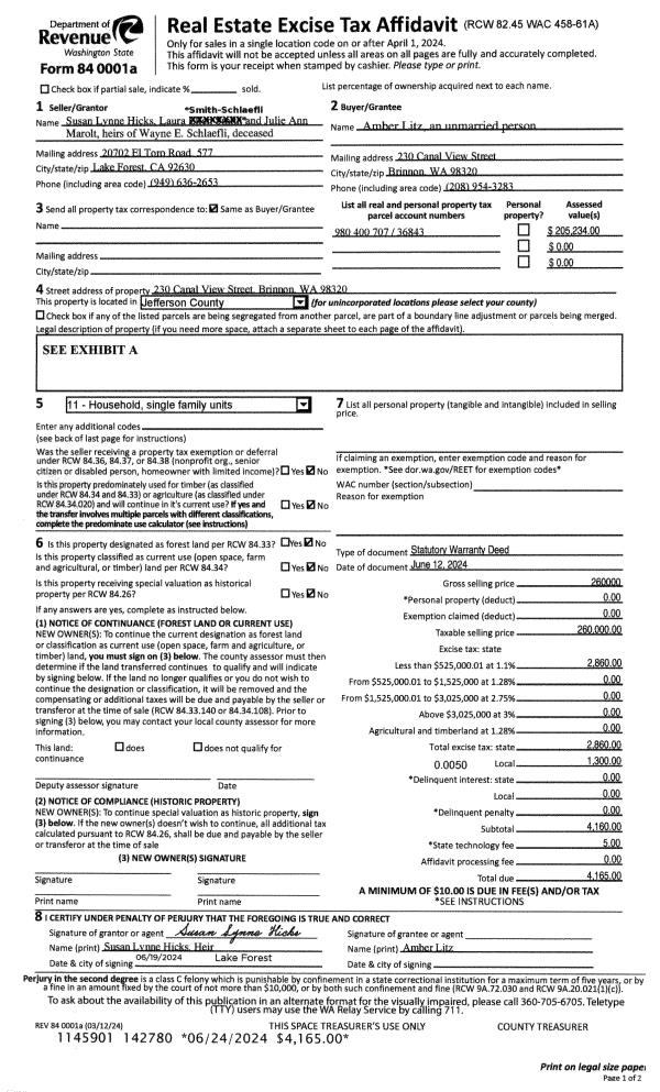 | 1 | 06/12/2024 | SWD | Statutory Warranty Deed | WAYNE E SCHLAEFLI | AMBER LITZ | | | $260,000.00 | 142780 | |