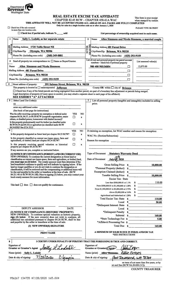 | 1 | 07/25/2020 | SWD | Statutory Warranty Deed | SALLY L LODAHL | ALLEN & NICOLA SIMMONS | | | $10,000.00 | 134735 | |