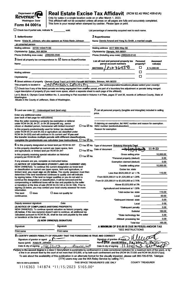 | 2 | 11/09/2023 | SWD | Statutory Warranty Deed | KRISTA M JOHNSON | DENNIS AMARAL | | | $10,000.00 | 141874 | |