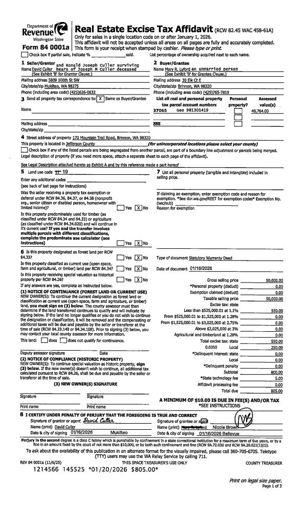 | 1 | 01/16/2026 | SWD | Statutory Warranty Deed | DAVID CULLER | MARY R LYFORD | | | $50,000.00 | 145525 | |