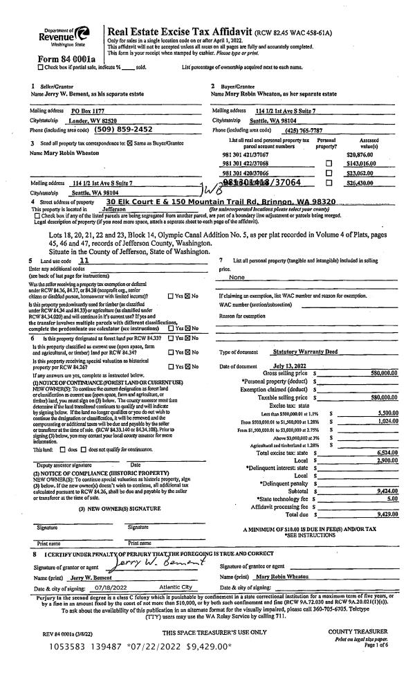 | 1 | 07/13/2022 | SWD | Statutory Warranty Deed | JERRY W BEMENT | MARY R WHEATON | | | | 139487 | |