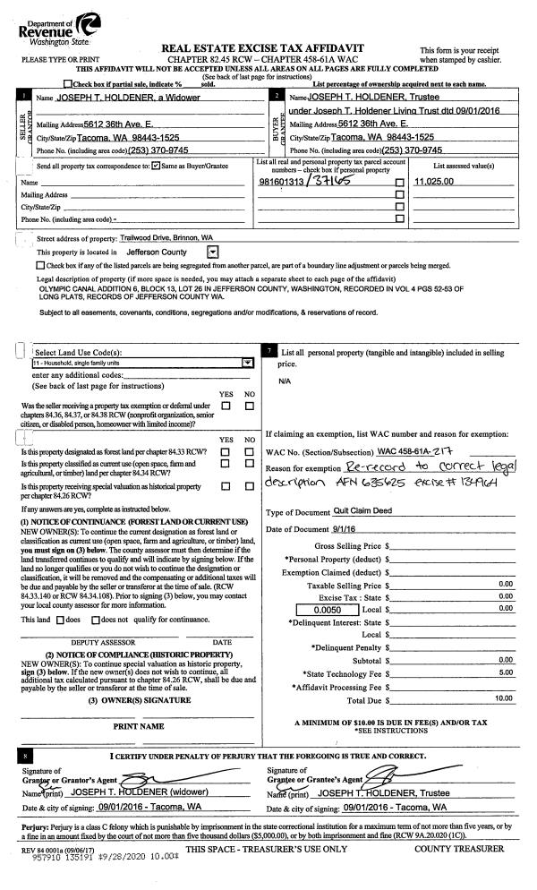 | 2 | 09/01/2016 | QCD | Quit Claim Deed | JOSEPH T HOLDENER | JOSEPH T HOLDENER LIVING TRUST | | | | 134964 | |