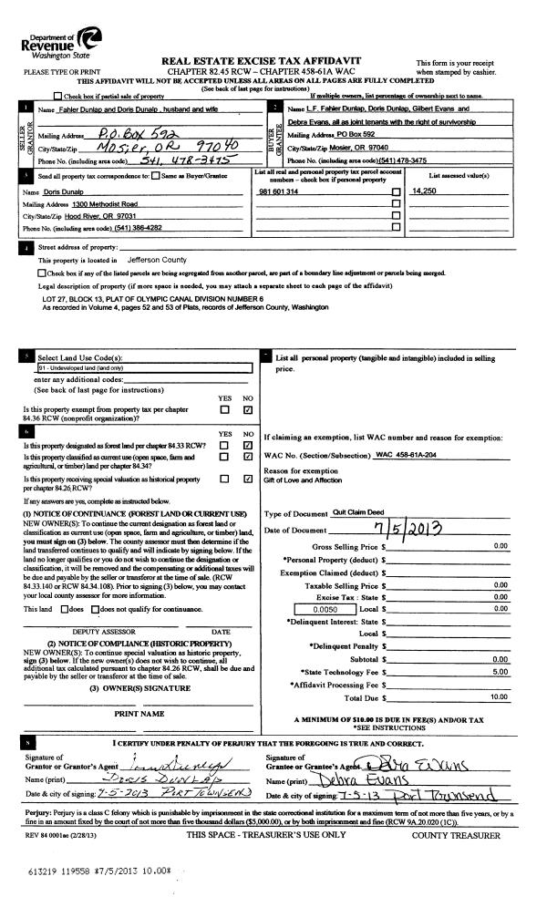 | 1 | 07/05/2013 | QCD | Quit Claim Deed | GILBERT & DEBRA EVANS | LF FAHLER DUNLAP | | | | 119557 | |