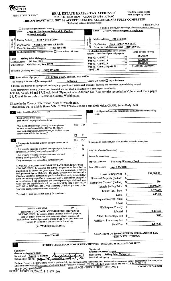| 3 | 04/23/2018 | SWD | Statutory Warranty Deed | GREGG H DEBORAH L ZANFINO | JEFFERY J MALMGREN | | | $139,000.00 | 130019 | |